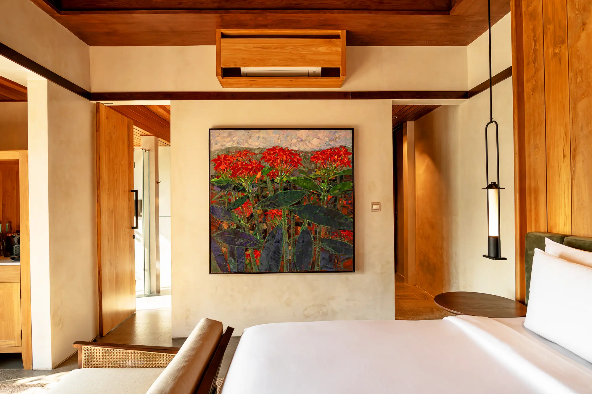Teak wood with fabric wall-hangings and selected Indonesian artefacts